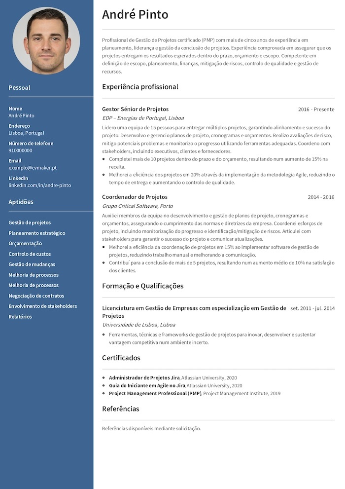 Quer seja um profissional experiente em gestão de projetos ou alguém a iniciar a carreira, e necessite de criar um currículo, consulte a página de exemplos de CV para mais ideias!